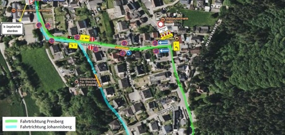 - Fahrtrichtung Presberg: Der Verkehr wird über den Kirchweg und die Straße Im Wiesental geleitet.